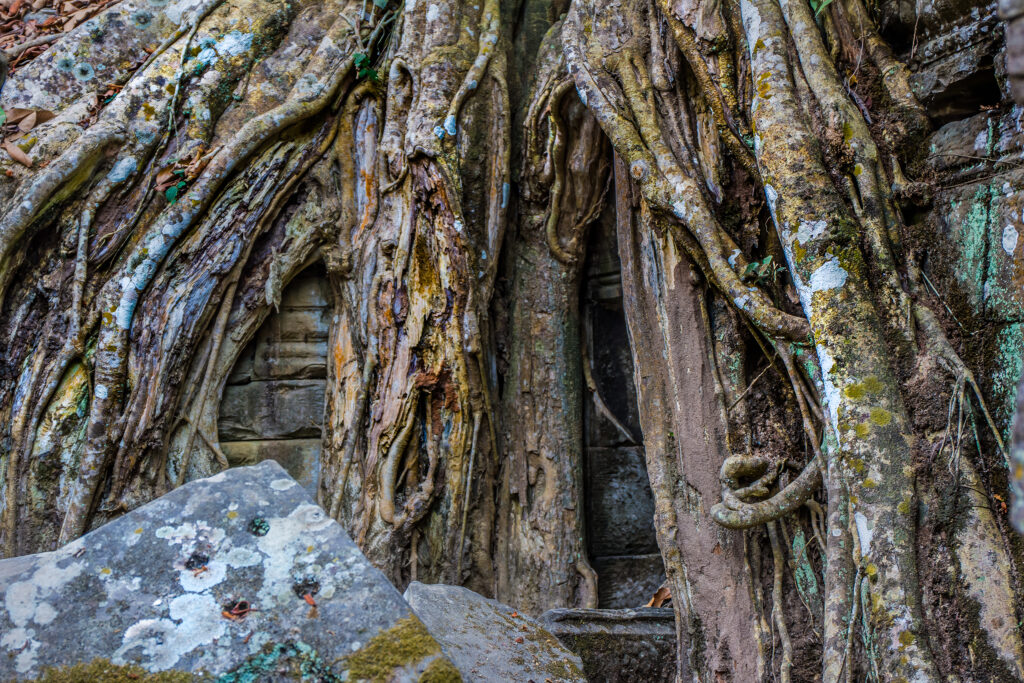 映画「トゥームレイダー」の舞台としても有名なタ・プロームは、巨大なガジュマルの根が寺院の石造りの壁を侵食している姿が特徴的な寺院です。ジャングルの中に半ば飲み込まれたような姿は、自然の力と時間の流れを感じさせ、他に類を見ない神秘的な雰囲気を醸し出しています。