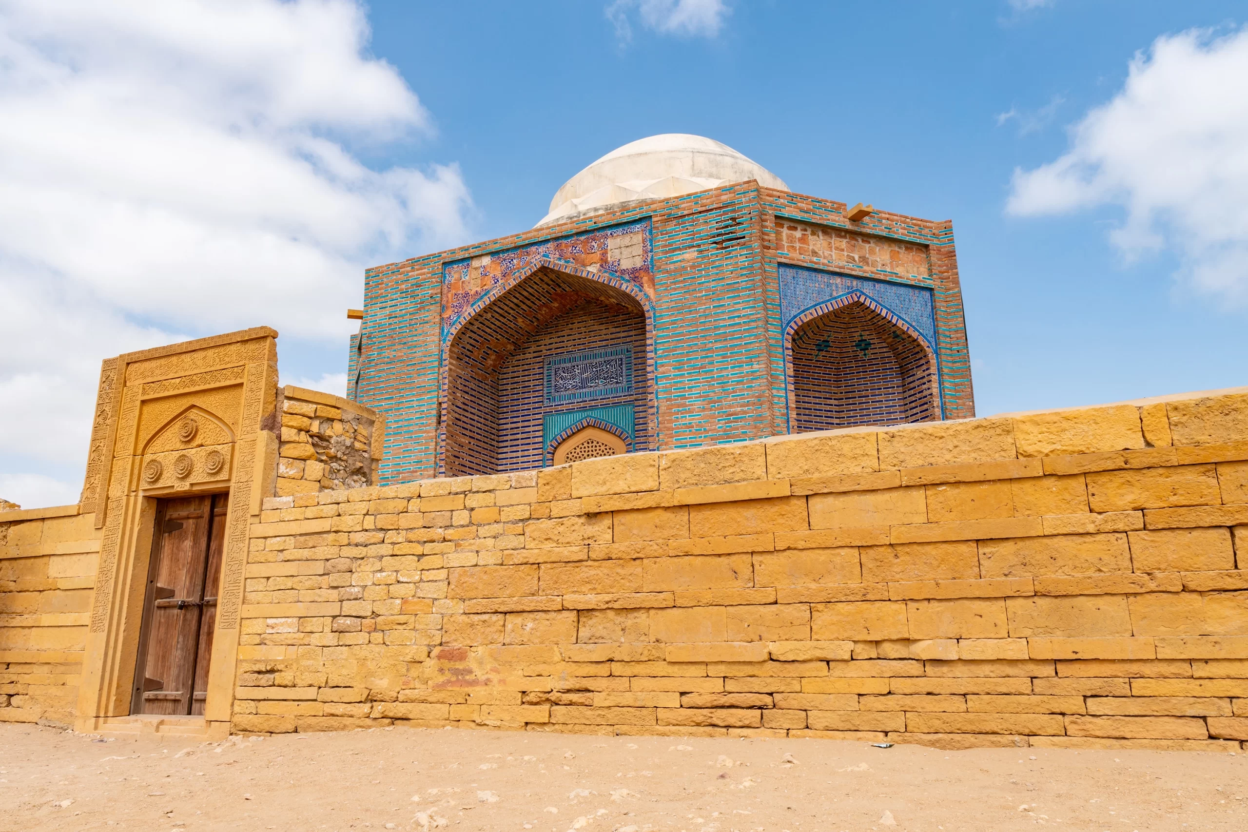 タッタの街中にあるこのモスクは、ムガル帝国皇帝シャージャハーンによって建設されました。その最大の特徴は、美しい青い釉薬タイルで覆われたドームと内部です。モスクにはミナレットがなく、その独特なデザインはペルシアの影響を受けているとされています。