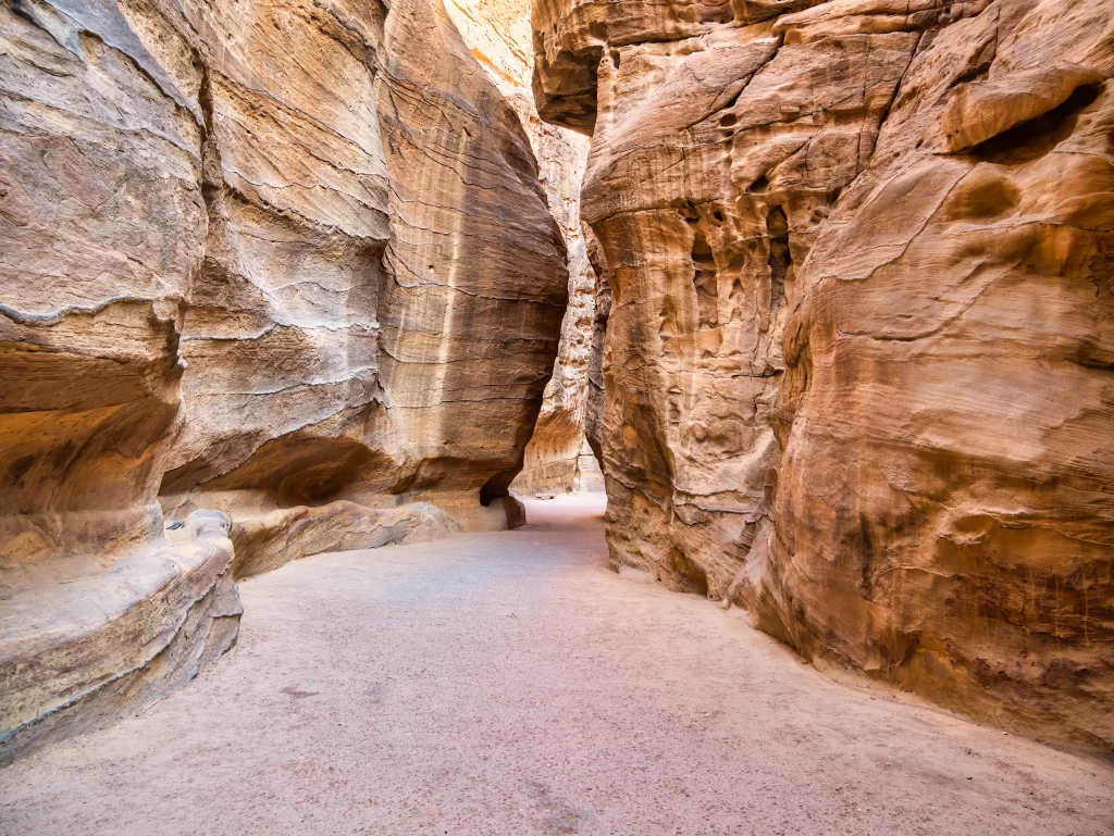 ペトラへの唯一の入口となる、約1.2km続く狭い渓谷です。両側には高さ80mにもなる岩壁がそびえ立ち、その間を抜ける道のりは、まさに冒険の始まりを感じさせます。