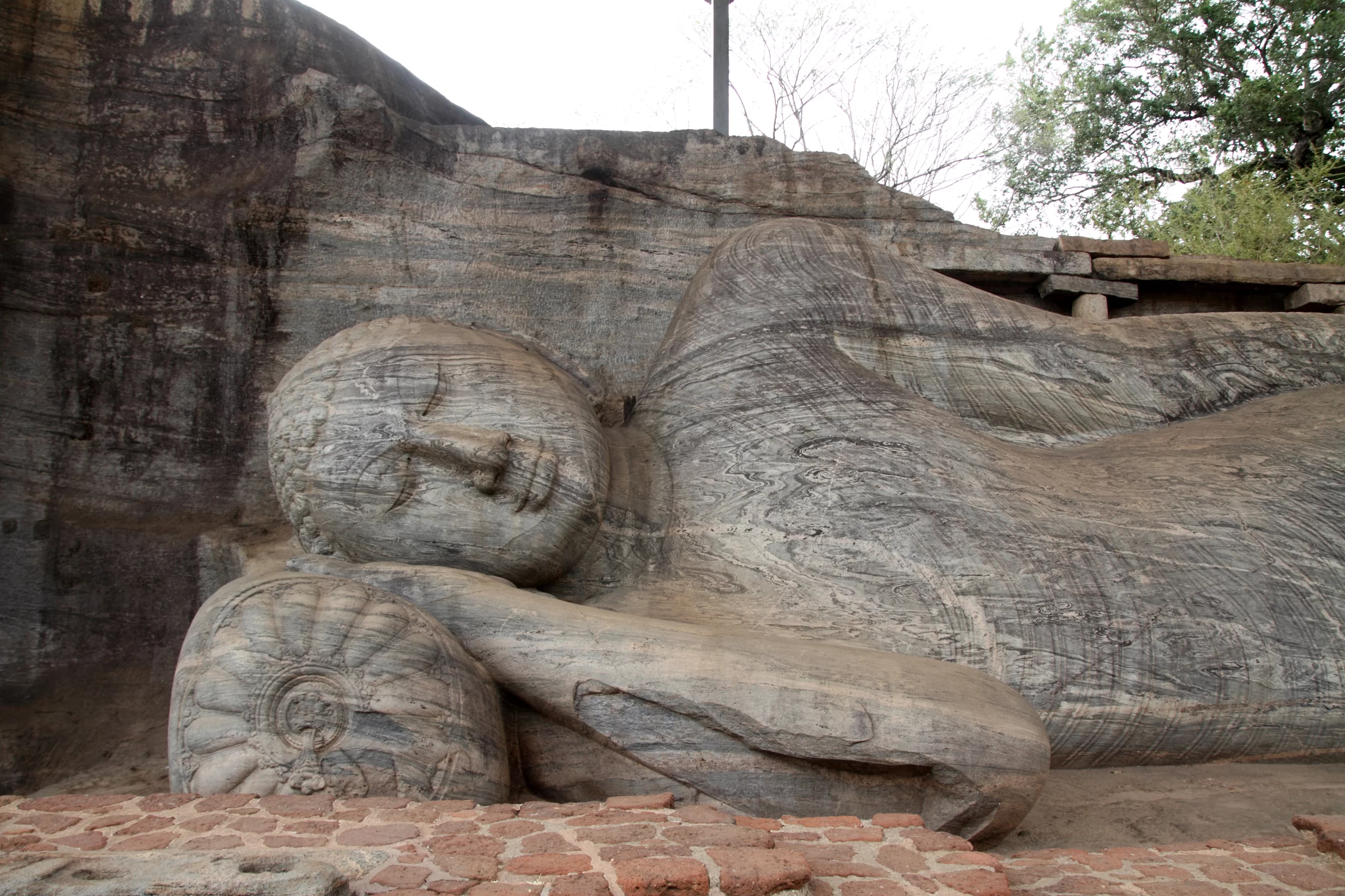 ポロンナルワを代表する仏教芸術の傑作です。巨大な花崗岩をくり抜いて造られた、4体の仏像が並んでいます。座像、立像、そして有名な涅槃像の穏やかな表情は、見る者に深い感動を与えます。特に涅槃像は、その圧倒的なスケールと静謐な美しさで、スリランカ仏教芸術の最高峰と称されています。